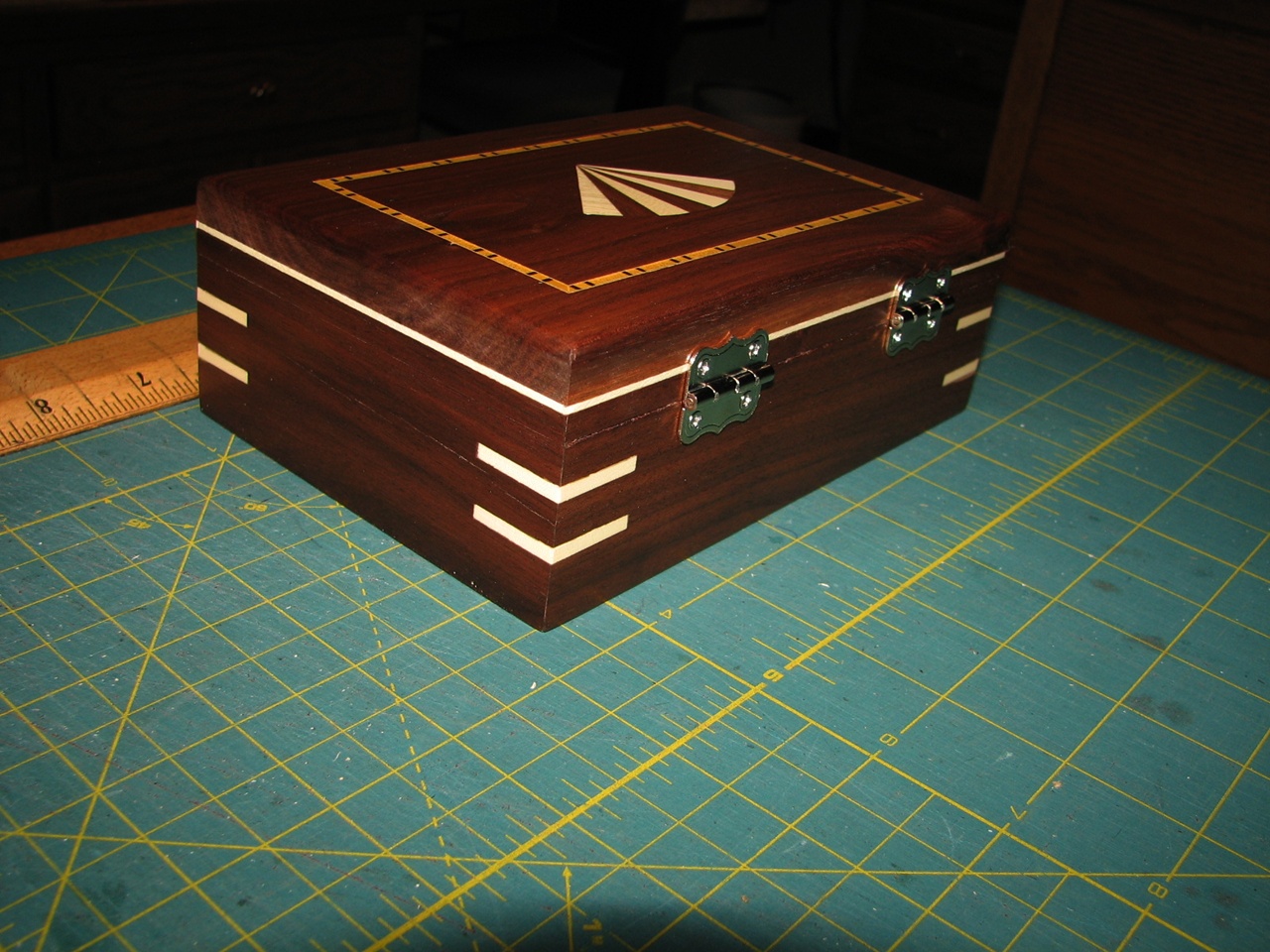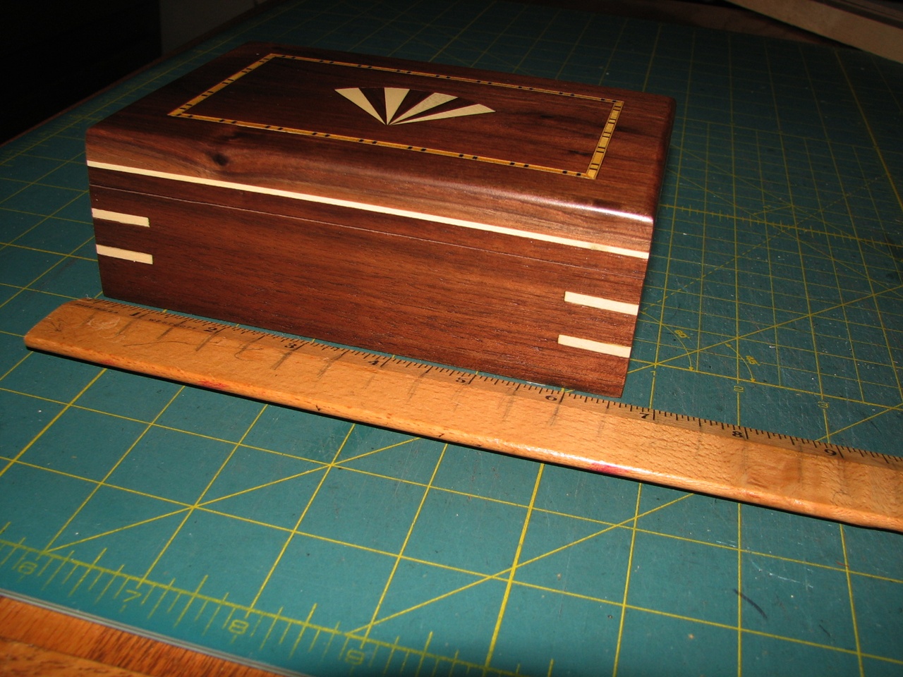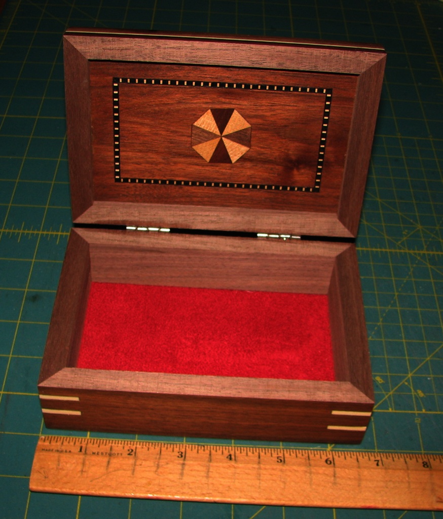 Small walnut keepsake box. The primary wood is American Black Walnut. This box will stand the test of time. The joints are solid and will not separate over time. Guaranteed not to warp or twist. Lined with red suede. A solid box! Overall dimensions are about 4 X 6 X 2. This box and all inlays are made in my shop in North Carolina.