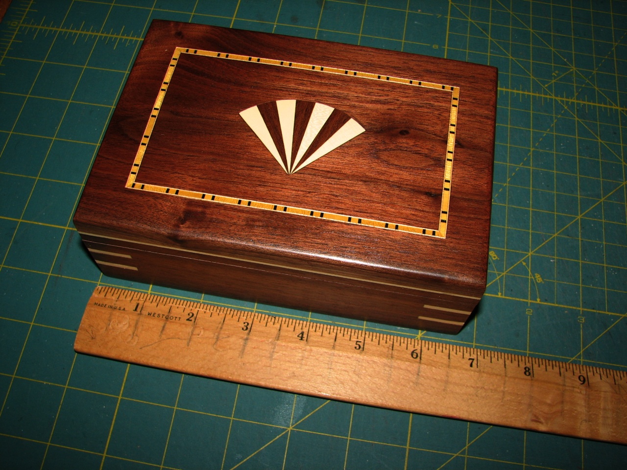 This is a sapele (Africa, mahogany-like) box with a hand-made fan inlay