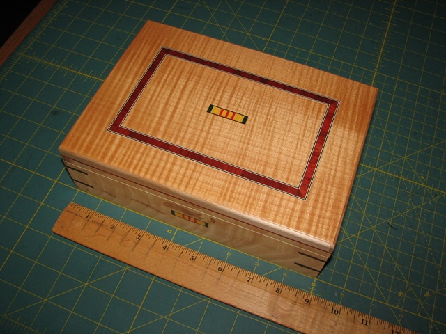 This is a Maple box with wood inlays. All inlays including the Vietnam Service Ribbon are made from wood, and inlayed flush to the surface.